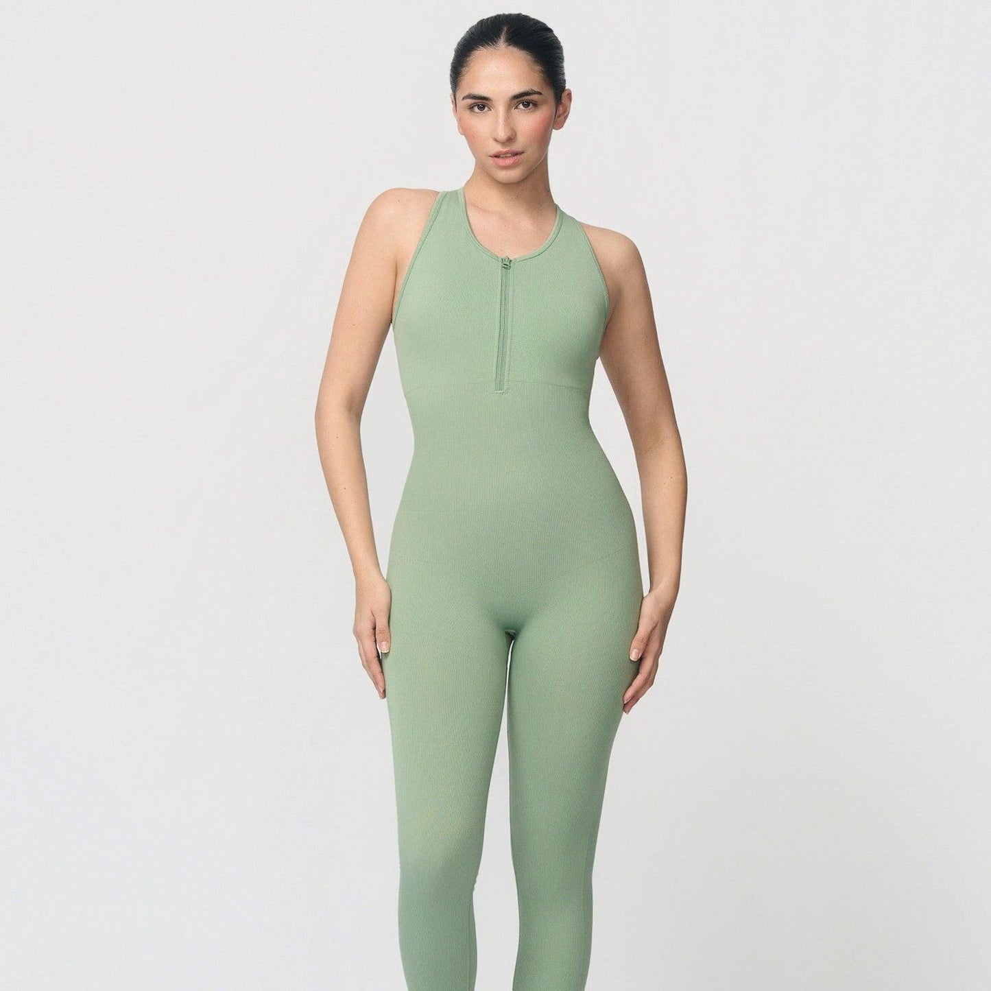 Formender Overall mit Frontreißverschluss, herausnehmbaren Einsätzen für leichte Brustunterstützung und einem Shaping-Effekt, der die Taille betont und den Po anhebt. Breite Träger bieten guten Halt, während der atmungsaktive und dehnbare Stoff für ganztägigen Tragekomfort sorgt.