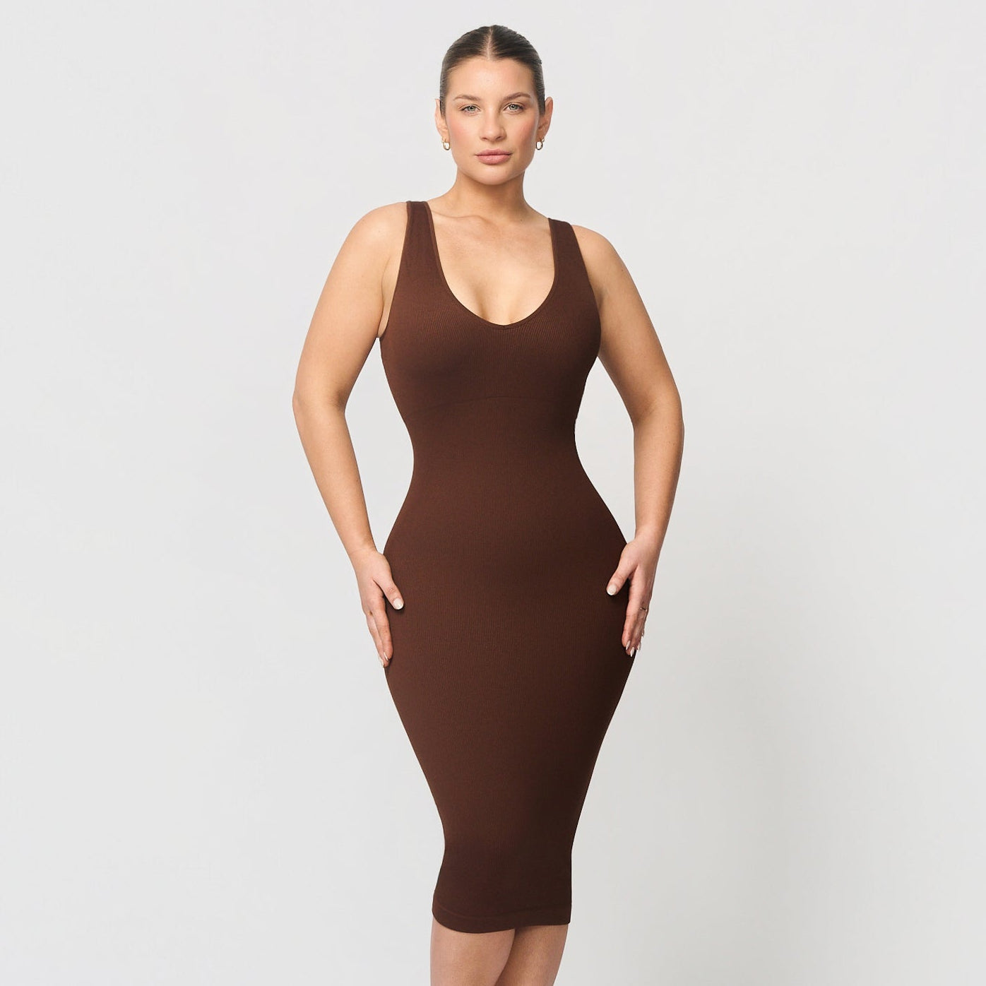Shaping dress in soft and elastic fabric with a double layer at the bust and removable pads that allow it to be worn without a bra. The waist provides extra compression that shapes and smooths the silhouette.